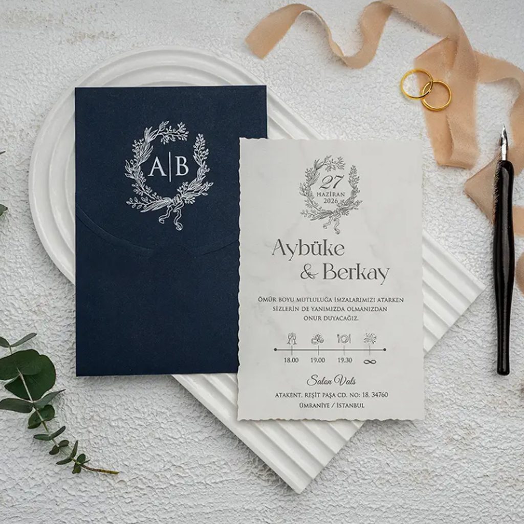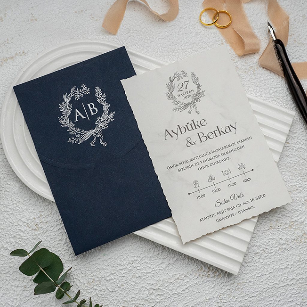 Davetiyenin kalbi, derin lacivert rengindeki dokulu zarfıdır. Zarfın dış yüzeyinde kullanılan gümüş varaklı monogram mühür detayı, davetiyenize kişiye özel bir mühür etkisi katarak prestijini artırır. Gümüş ve lacivert uyumu, 2026 düğün trendlerinin en asil kombinasyonlarından biridir.
