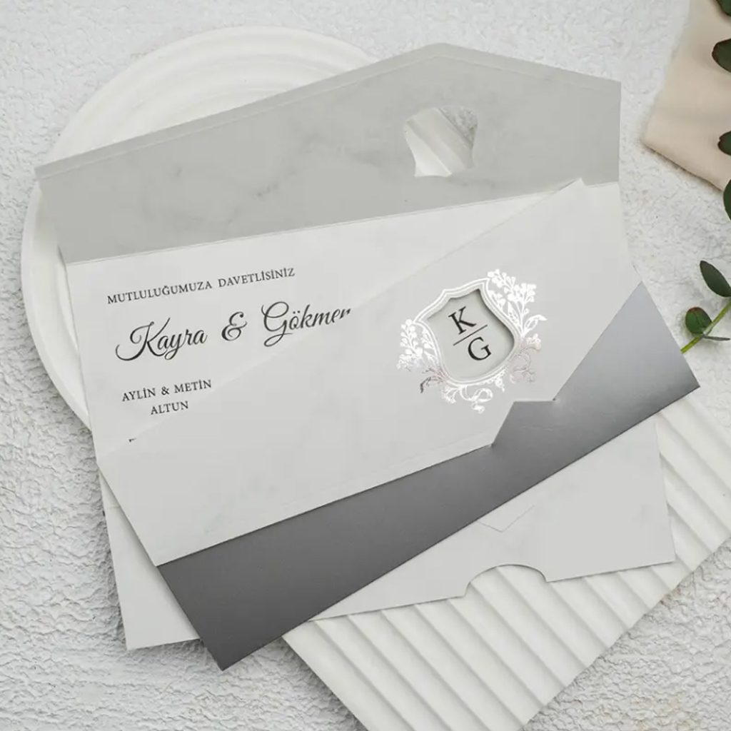 Gri ve beyazın dingin uyumu, modern düğün temaları için en çok tercih edilen paletler arasındadır. 100 Adet Lüks Katlamalı Düğün Davetiyesi Ekonom 9312, sade ama etkileyici yazı fontları ile okunabilirliği en üst seviyede tutarken, estetikten ödün vermez.