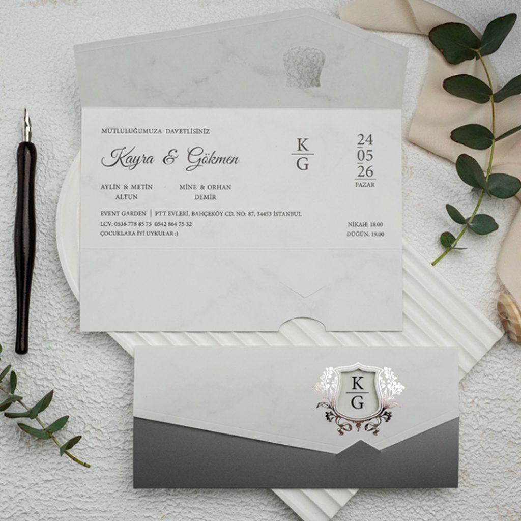 Bu modelin en dikkat çekici özelliği, zarfın üzerindeki özel kesim penceredir. Gümüş varak işlemelerle çevrelenen bu alanda, çiftlerin baş harfleri (monogram) ön plana çıkar. Bu detay, davetiyenize kişiye özel bir mühür etkisi katarak prestijini artırır.