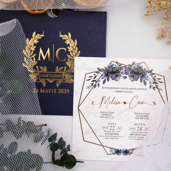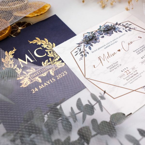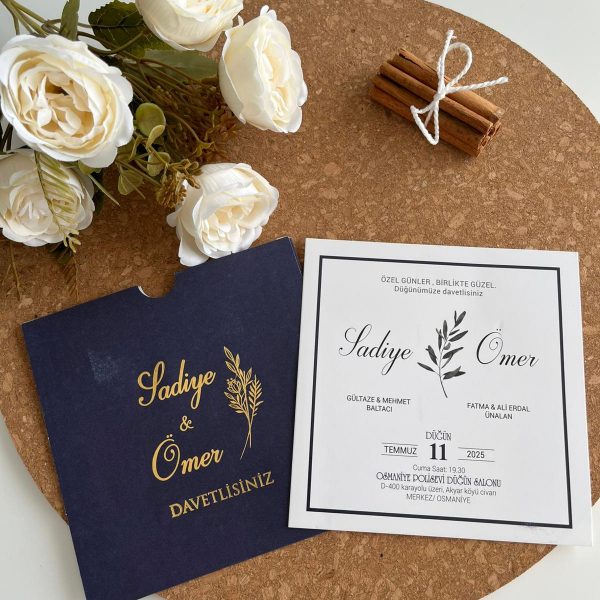 Lacivertin zamansız zarafeti ile altın yaldızın ışıltısını buluşturan bu kare davetiye modeli, asil ve ağırbaşlı bir konsept arayan çiftler için özel olarak tasarlandı. Zarf üzerindeki altın varak baskılı botanik motifler, davetinize klasik ama modern bir estetik katıyor.