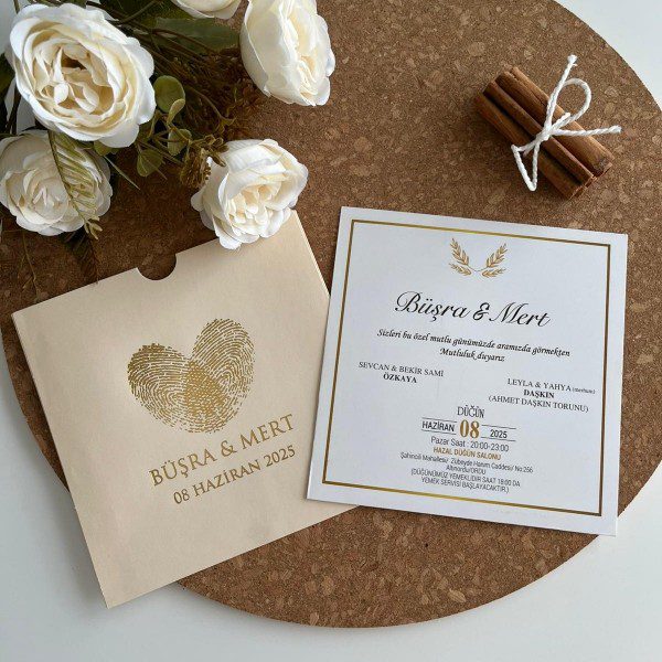 Zarf üzerindeki parmak izi kalp detayı, birlikteliğinizin benzersizliğini ve imzasını simgelerken; iç karttaki altın varak baskı detayları davetinize göz alıcı bir şıklık katıyor.