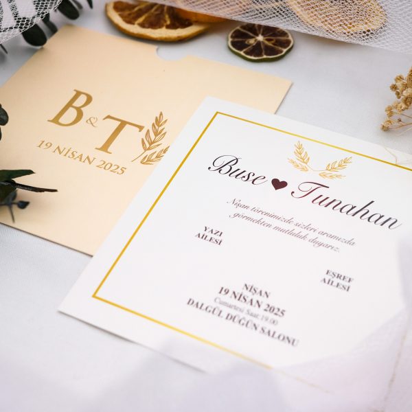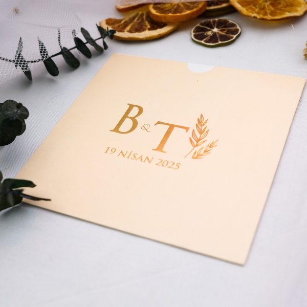 Hayatınızın en özel gününü, zarafeti ve sadeliği bir araya getiren şık bir tasarımla duyurun. Krem tonlarının sıcaklığı ile altın yaldızın asaletini buluşturan bu kare davetiye modeli, modern ve minimalist bir tarz arayan çiftler için özel olarak tasarlandı.
