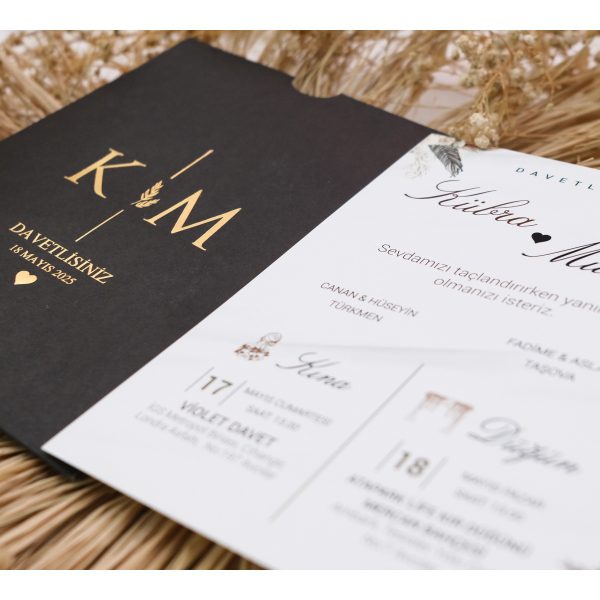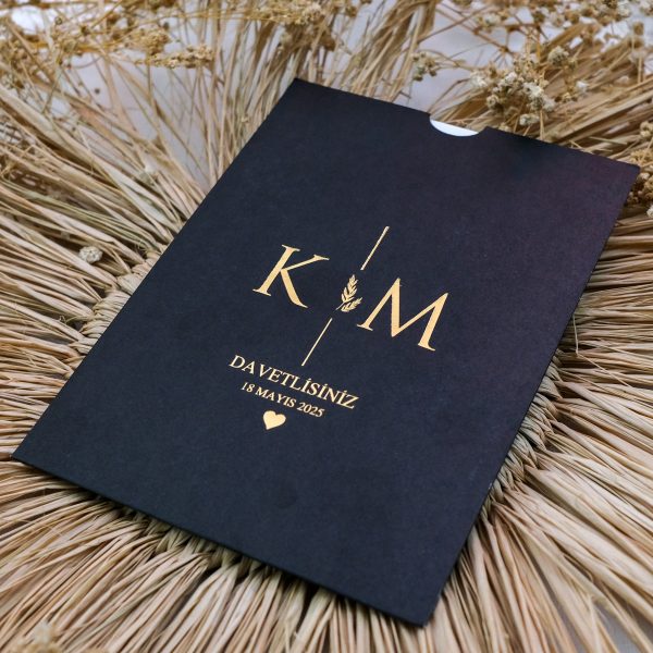 Siyahın asaletini, kişiselleştirilmiş monogram detaylarıyla birleştiren bu kare model, lüks ve zarafeti aynı anda sunuyor. 190 gr. renkli özel kağıttan üretilen dış zarf, tercihinize göre Altın veya Gümüş yaldız baskı ile hayat buluyor. Baş harflerinizin birleştiği modern tasarımıyla bu davetiye, özel gününüzün ilk unutulmaz detayı olacak.