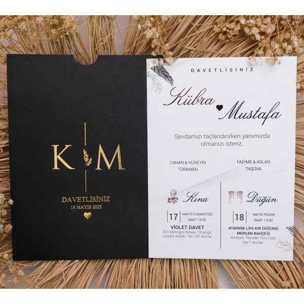 ⚠️ Not: Davetiyelerde kullanılan kağıt ve yaldızlarda, üretim serisine bağlı olarak hafif ton farklılıkları görülebilir; bu durum hammadde doğallığından kaynaklı bir özellik olup hata değildir.
