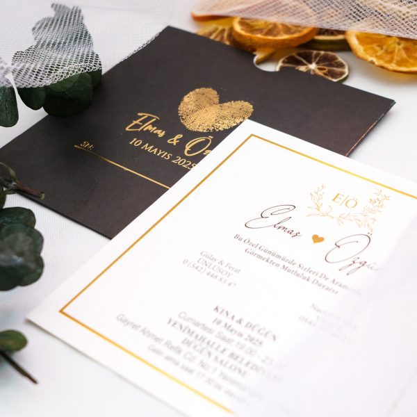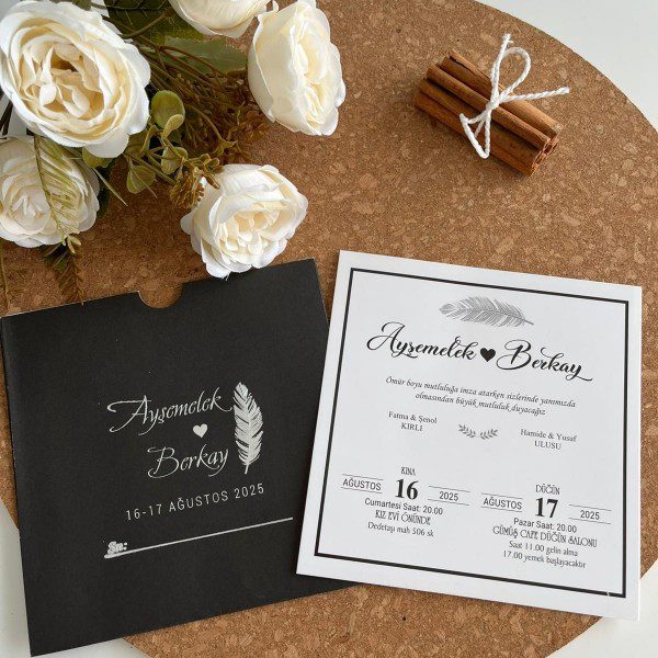 İç kart tasarımında yer alan tüy detayı ve net yazı karakterleri sayesinde hem düğün hem de kına bilgilerinizi tek bir davetiyede şık ve okunabilir bir şekilde sunabilirsiniz. Sadelikten yana olan ama şıklığından ödün vermek istemeyenlerin favorisi olacak bir konsept.