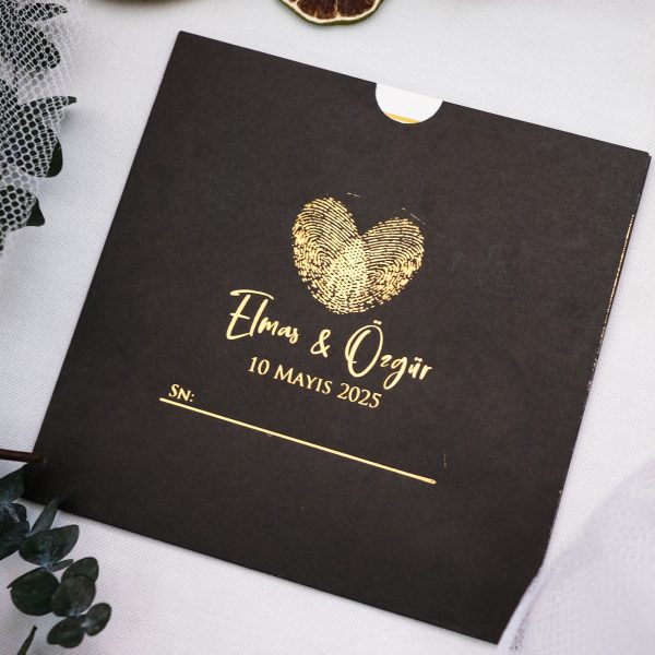 Siyahın asaleti ile beyazın zarafetini bir araya getiren bu minimalist kare davetiye, modern bir çizgi arayan çiftler için tasarlandı. Zarfın üzerindeki gümüş tonlardaki tüy motifi ve şık tipografi, davetinize ağırbaşlı ve estetik bir hava katıyor.